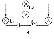 在圖4的電路中,當(dāng)閉合開關(guān)S后,發(fā)現(xiàn)兩燈都不亮,電流表的指針幾乎指在零刻度線不動,電壓表指針則有明顯偏轉(zhuǎn),該電路中的故障可能是( )![]()