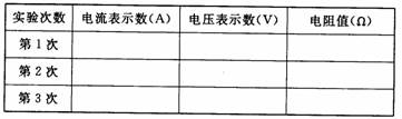 用電流表和電壓表測(cè)量電阻的實(shí)驗(yàn)電路,如圖所示。為了減小誤差,需要進(jìn)行三次測(cè)量求平均值。請(qǐng)你設(shè)計(jì)一個(gè)記錄數(shù)據(jù)的表格。