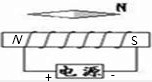 利用右手螺旋定則,可以確定,螺線管中的電流方向是從螺線管的左端流入,右端流出.電流在電源的外部是從電源的正極流出,經(jīng)過外電路回到電源負(fù)極.故電源的左端為正極,右端為負(fù)極.故答案如下圖.