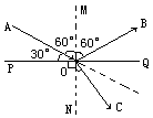 無(wú)論反射光路還是折射光路,都必須確定法線的位置,因?yàn)榉瓷涔饩與折射光線均與法線有密切的聯(lián)系.所以本題先過(guò)入射點(diǎn)作垂直界面的直線即法線,然后在法線右側(cè)量一個(gè)與入射角等大的角,作出反射光線.折射光線畫(huà)法是定性的,所以將入射光線延長(zhǎng)后在其延長(zhǎng)線斜下方畫(huà)一條與法線夾角小于入射角的直線即可表示為折射光線. 、龠^(guò)O點(diǎn)作PQ水面垂線MN,注意虛線,用垂直號(hào)表示垂直. ②作∠MOB= 、垩娱L(zhǎng)AO(虛線延長(zhǎng))在AO延長(zhǎng)部分下方作折射光線OC. 據(jù)圖可知入射角
