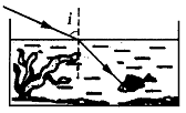 如圖所示,一條入射光線從空氣斜射向魚缸中的水面,折射光線進(jìn)入魚眼(已畫出)。請(qǐng)畫出入射光線的大致方向,并標(biāo)明入射角i。