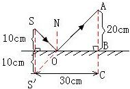 (2)作輔助線S′C平行于鏡面,AC垂直于鏡面,則AC=AB+BC=30cm