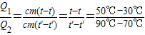 ,一塊金屬溫度從30℃上升到50℃,吸收的熱量為Q1,溫度從90℃降低到70℃,放出的熱量為Q2,則Q1
