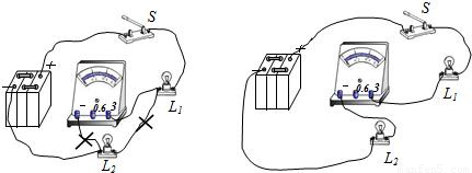 (3)將乙圖中L1 、L2兩只燈泡連接成并聯(lián)電路,電流表測干路中的電流。右圖是電流表測得的某次電流,則該電路中電流是 安(連電路4分,讀數(shù)1分)
