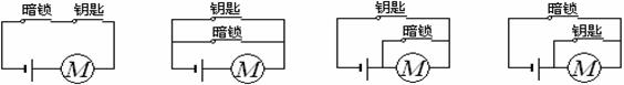 小轎車一般都設(shè)有暗鎖開關(guān),只有閉合暗鎖開關(guān),并同時(shí)使用鑰匙才能啟動(dòng)轎車. 那么下面關(guān)于暗鎖開關(guān)和鑰匙開關(guān)的電路圖正確的是( )