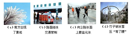 2)(08江蘇連云港)今年春節(jié)前后我國南方部分地區(qū)遭遇了低溫雨雪天氣,對以下與之相關的各圖,說法中