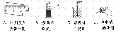 | A、 用刻度尺測(cè)量長(zhǎng)度 | B、 量筒的讀數(shù) | C、 溫度計(jì)的使用 | D、 測(cè)電筆的使用 |