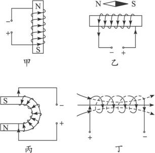 根據(jù)所給條件,利用圖14-3-10中各螺線管的電流方向,判斷所接電源的正負(fù)極。![]()