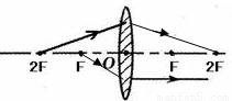 (2)凸透鏡對光線有會(huì)聚作用,物體位于2倍焦距時(shí),像也位于2倍焦距;從焦點(diǎn)發(fā)出的光線經(jīng)凸透鏡折射后與主光軸平行,如下圖: