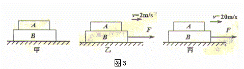 A、B兩物體疊放在水平桌面上,在如圖3所示的三種情況下:①甲圖中兩物體均處于靜止?fàn)顟B(tài);②乙圖中水平恒力F作用在B物體上,使A、B一起以2m/s的速度做勻速直線運(yùn)動(dòng);③丙圖中水平恒力F作用在B物體上,使A、B一起以20m/s的速度做勻速直線運(yùn)動(dòng)。比較上述三種情況下物體A在水平方向的受力情況,以下說(shuō)法正確的是( )