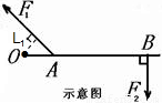 如圖所示,當人曲臂將重物托起時,人的前臂可以看作一個杠桿,肱二頭肌對前臂A處的拉力為動力,B處握著的重物對手臂向下的壓力為阻力。請在示意圖上畫出F1的力臂。若OA=3cm,AB=27cm, F1的力臂為2cm,當水平托住0.5kg重物時,肱二頭肌的收縮力為________N。![]()