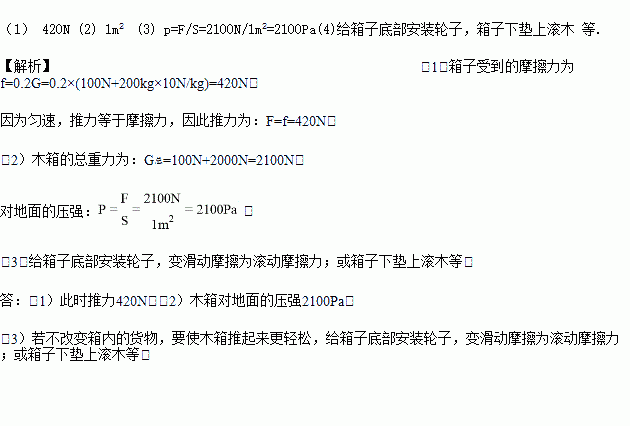 一個(gè)邊長(zhǎng)為1m的正方體木箱重100N,其中裝有200kg的貨物,在水平地面上推動(dòng)木箱勻速前進(jìn)時(shí),受到的摩擦力為總重的0.2倍。(本題中g(shù)取10N/kg)求: