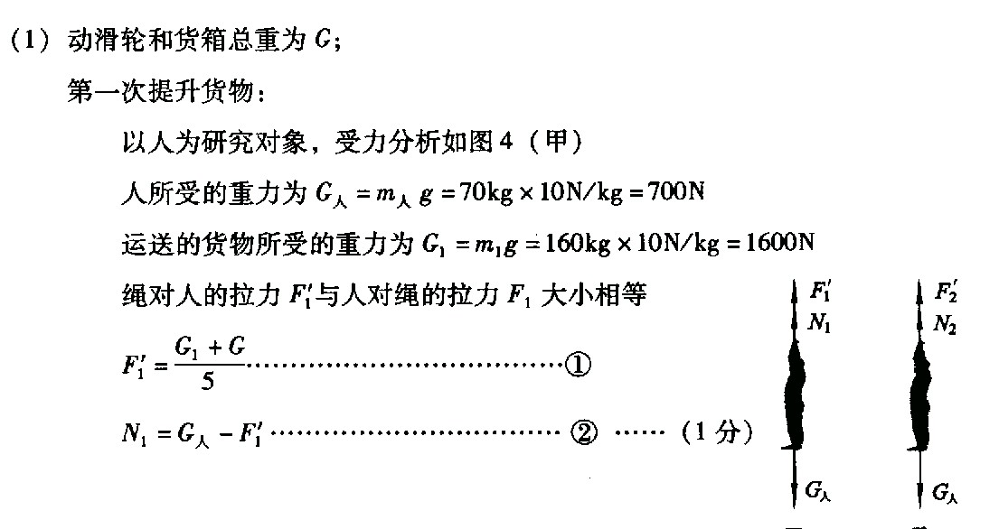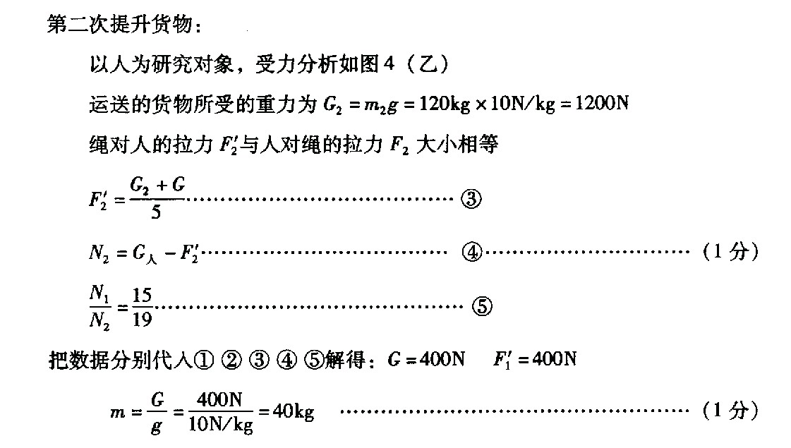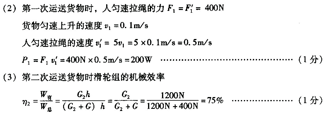 如圖所示,質(zhì)量為70 kg的工人站在水平地面上,用帶有貨箱的滑輪組把貨物運(yùn)到高處.第一次運(yùn)送貨物時(shí),放入貨箱的貨物質(zhì)量為160 kg,工人用力F1勻速拉繩的功率為P1,貨箱以0.1 m/s的速度勻速上升,地面對(duì)工人的支持力為N1.第二次運(yùn)送貨物時(shí),放入貨箱的貨物質(zhì)量為120 kg,工人用力F2勻速拉繩,貨箱以0.2 m/s的速度勻速上升,地面對(duì)工人的支持力為N2,滑輪組機(jī)械效率為η2.N1與N2之比為15∶19.(不計(jì)繩重及滑輪摩擦,g取10 N/kg)