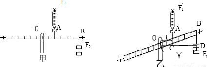 如圖乙,杠桿在乙圖位置平衡時,F(xiàn)1′的力臂為OC=OA×cos∠BOD,F(xiàn)2的力臂為OD=OB×cos∠BOD.