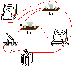 分析:首先要分析電路圖,弄清電路的接法,利用“去表法”可知燈L1、L2并聯(lián)接入電路,其中從電源正極分流點a的干路上有一個開關(guān)S,它控制所有的燈,從匯流點b到電源負極的干路用導線連接。有兩條支路,一條支路上只有一盞燈L1。電壓表測它兩端的電壓;另一條支路上有燈L2和電流表,電流表測的是通過燈L2的電流。在電路圖上標出電流表的正、負接線柱。