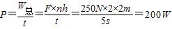 解答:已知:G=400N,h=2m,F(xiàn)=250N,n=2,t=5s