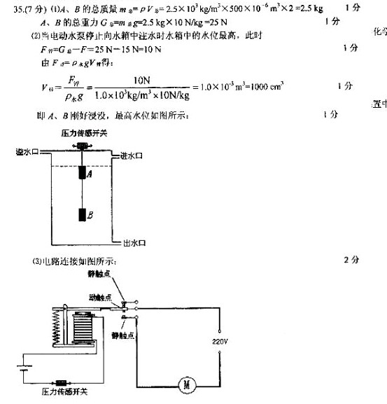 新農(nóng)村中很多樓房頂上裝有如圖1所示的水箱,圖2是這種水箱的結(jié)構(gòu)示意圖。其中A、B是由密度為2.5×103kg/cm3的材料制成的圓柱體,由于水箱頂部的壓力傳感開(kāi)關(guān)是一種特殊的“拉線開(kāi)關(guān)”,其作用是:當(dāng)它受到豎直向下的拉力等于25N時(shí)閉合,電動(dòng)水泵就開(kāi)始通過(guò)進(jìn)水口向水箱中注水;當(dāng)拉力等于15N時(shí)斷開(kāi),電動(dòng)水泵就停止向水箱中注水。