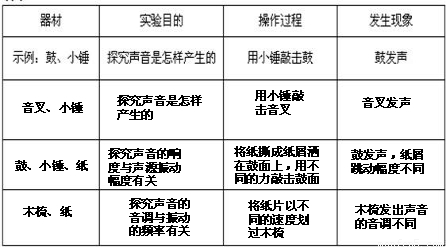| 示例:鼓、小錘 | 探究聲音是怎樣產(chǎn)生的 | 用小錘敲擊鼓 | 鼓發(fā)聲且鼓面在振動 |