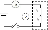 在圖中,電壓表的示數(shù)為6V,電流表的示數(shù)為0.2A,若圖中虛框內(nèi)只有兩個(gè)電阻,其中的一個(gè)電阻R1=10Ω,求: