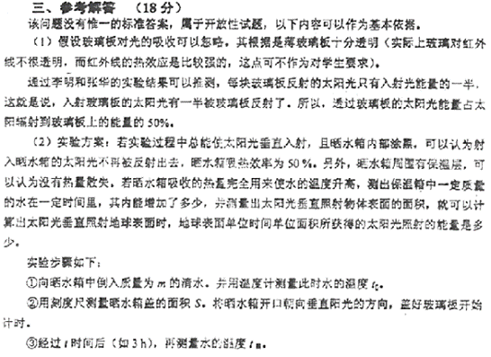 三、(18分)有人在夏季用簡易曬水箱給水加熱用來淋浴,這不僅能節(jié)省能源,而且很方便。李明和張華想利用這樣的裝置估測太陽光對地球表面輻射的強度的大小。也就是說,太陽光垂直照射地球表面時,地球表面單位時間單位面積所獲得的能量是多少。實驗裝置如圖2所示,曬水箱內(nèi)部是被涂黑的,箱體外加了保溫層,上面開口并蓋有透明玻璃板。