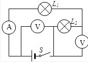 這樣電路就構(gòu)成了一個(gè)L1L2串聯(lián),電流表測(cè)量電路電流,電壓表分別測(cè)量電源電壓和L2兩端電壓的串聯(lián)電路.