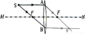 (4分)如圖所示,SA、SB是光源S發(fā)出的兩條光線。其中SA平行于主光軸,SB過左焦點,利用這兩條光線通過凸透鏡的折射光線找到像S’的位置(注意標出箭頭方向)。