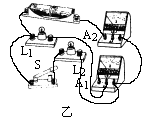 根據(jù)圖甲所示的電路圖將圖乙所示的電器元件連成實(shí)物電路,閉合開(kāi)關(guān)后,兩只電流表的示數(shù)如圖所示,由此可知電流表A1的示數(shù)是________A,電流表A2的示數(shù)是________A.