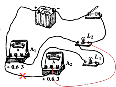 (3)圖中接錯(cuò)的地方有:A2接線柱的連接方式有誤,且A2、L1所在支路被短路.只允許改其中一條導(dǎo)線,就應(yīng)考慮A1、A2之間的導(dǎo)線;由圖知:通過(guò)A2的電流需從“+”流入,“0.6”流出,因此將A1、A2之間的連線改接到燈L2右接線柱或開(kāi)關(guān)的右接線柱即可.