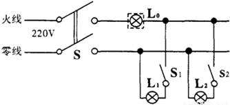 如圖是新安裝的照明電路,已知兩個燈泡的燈頭接線存在一處故障。小明在保險絲處接入一個“220V、40W”的燈泡。當(dāng)只閉合S、S1時L0和L1都呈暗紅色;當(dāng)只閉合S、S2時,L0正常發(fā)光,L2不發(fā)光。則:( )