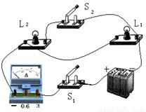 【答案】分析:把L2與S2串聯(lián)后,再與L1并聯(lián),電流表、開關(guān)S1串聯(lián)在干路中.