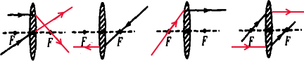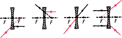 (2)平行于主光軸的光線經(jīng)凹透鏡折射后,其折射光線的反向延長(zhǎng)線過(guò)焦點(diǎn);延長(zhǎng)線過(guò)另一側(cè)焦點(diǎn)的光線經(jīng)凹透鏡折射后將平行于主光軸;過(guò)光心的光線經(jīng)凹透鏡折射后傳播方向不改變,如圖所示: