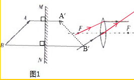 分析:(1)平面鏡成像的特點:像物大小相等、連線與鏡面垂直、到平面鏡的距離相等、左右互換,即像物關(guān)于平面鏡對稱,利用這些關(guān)系作出物體AB的像.(2)凸透鏡的特殊光線有三條:過光心的光線其傳播方向不變,平行于主光軸的光線經(jīng)凸透鏡折射后折射光線通過焦點,過焦點的光線經(jīng)凸透鏡折射后折射光線平行于主光軸;