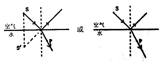 如圖所示,一激光燈從點(diǎn)S發(fā)出的一束射向水面的光,在界面發(fā)生發(fā)射和折射,折射光線經(jīng)過P點(diǎn),請你在圖中作出入射光線及其相應(yīng)的反射光線和折射光線: