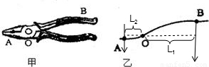 如圖甲所示的鋼絲鉗,A為剪鋼絲處,B為手的用力點(diǎn),0為轉(zhuǎn)動(dòng)軸,乙為單側(cè)鉗柄及相連部分示意圖.請(qǐng)?jiān)趫D乙中畫(huà)出剪鋼絲時(shí)的動(dòng)力F1、阻力F2、動(dòng)力臂l1、阻力臂l2