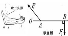 如圖所示,當(dāng)人曲臂將重物托起時,人的前臂可以看作一個杠桿,肱二頭肌對前臂A處的拉力為動力,B處握著的重物對手臂向下的壓力為阻力。請在示意圖上畫出F1的力臂。若OA=3cm,AB=27cm, F1的力臂為2cm,當(dāng)水平托住0.5kg重物時,肱二頭肌的收縮力為________N。![]()