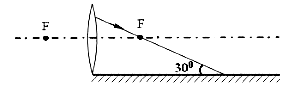 如圖所示,一束光射向凸透鏡經(jīng)折射后射到一個(gè)平面鏡上。請(qǐng)?jiān)趫D中畫(huà)出射向凸透鏡的這束入射光和經(jīng)平面鏡反射的光路,并標(biāo)出反射角的度數(shù)。![]()
