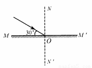 如圖所示,一細光束射到平面鏡MM'的O點處,請根據(jù)光的反射規(guī)律畫出它的反射光線,標明反射角大小。