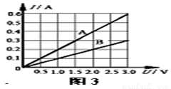 在某一溫度下,連接在電路中的兩段導體A和B中的電流與其兩端電壓的關系如圖3所示,由圖中信息可知( )