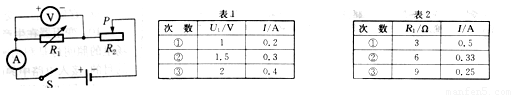 某同學(xué)按如圖所示的電路研究通過(guò)導(dǎo)體的電流與導(dǎo)體兩端的電壓、導(dǎo)體的電阻間的關(guān)系。若保持電源電壓的大小和電阻箱R1的阻值不變,移動(dòng)滑動(dòng)變阻器R2的金屬滑片P,可測(cè)得不同的電流、電壓值,如表1,然后,他又改變電阻箱R1的阻值,測(cè)得相應(yīng)的電流值,如表2.
