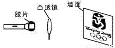 小明自制了一個(gè)簡(jiǎn)易投影儀(如圖),在暗室中將印有奧運(yùn)五環(huán)(紅、黃、藍(lán)、綠、黑五色環(huán))標(biāo)志的透明膠片,貼在發(fā)白光的手電筒上,并正對(duì)著焦距為10cm的凸透鏡。調(diào)整手電筒、凸透鏡、白色墻壁之間的位置,在墻上得到了一個(gè)清晰正立放大的像,下列說(shuō)法錯(cuò)誤的是( )