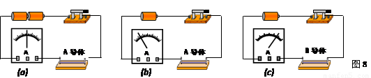 在“探究導(dǎo)體中電流與電壓的關(guān)系”的實(shí)驗(yàn)中,小李同學(xué)利用若干節(jié)新干電池作為電源,在電路中接入不同的導(dǎo)體A、B進(jìn)行實(shí)驗(yàn),其研究過程如圖8所示。請(qǐng)你仔細(xì)觀察和比較圖中的實(shí)驗(yàn)裝置、實(shí)驗(yàn)操作和電流表的偏轉(zhuǎn)情況,然后歸納得出初步結(jié)論:
