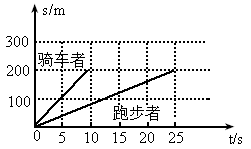 圖所示是一個(gè)騎自行車的人與一個(gè)跑步的人在運(yùn)動(dòng)時(shí)路程隨時(shí)間變化的圖像,根據(jù)該圖線能夠獲得合理的信息有:信息一,他們是同時(shí)開始運(yùn)動(dòng)的;信息二,________________;信息三,_________________。