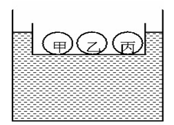 如圖所示,有三個(gè)實(shí)心小球甲、乙、丙,甲球在水中懸浮,乙球在水中下沉,丙球漂浮在水面上,F(xiàn)將甲、乙、丙三球同時(shí)放在一只敞口的小鐵盒里,然后將小鐵盒漂浮在盛水的容器中,下列判斷不正確的是:
