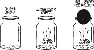 如圖所示,取一個瓶口直徑小于雞蛋的瓶子,在瓶底鋪層沙子,點燃浸過酒精的棉花,把它放入瓶中,再用剝了皮的熟雞蛋填住瓶口,結(jié)果雞蛋進到瓶子里,造成這一現(xiàn)象的主要原因是