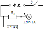 (2011?吉安三模)如圖所示,電源兩端電壓在220~240V之間波動(dòng),新型電子器件的阻值能夠隨著電壓變化而自動(dòng)改變,燈泡L只能夠在220V 1A的條件下工作.若我們將20Ω的定值電阻R0與這種新型電子器件并聯(lián)后,燈泡就始終能夠正常工作.所以當(dāng)電源兩端的電壓為220V時(shí),該新型電子器件的阻值為