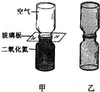 (2011?南沙區(qū)一模)在裝著紅棕色二氧化氮?dú)怏w的瓶子上面(二氧化氮的密度大于空氣密度),倒扣一個(gè)空瓶子,使兩個(gè)瓶口相對(duì),兩瓶口之間用一塊玻璃板隔開(圖甲).抽掉玻璃板后,最終發(fā)現(xiàn)兩瓶?jī)?nèi)氣體顏色基本相同(圖乙).這是