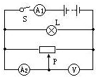 有器材:電池組、開關(guān)、滑動變阻器、小燈泡、電流表和電壓表各一個,導(dǎo)線若干,請設(shè)計一個電路,要求:當(dāng)開關(guān)S合上,滑片P向右滑動時,電流表的示數(shù)減小,電壓表的示數(shù)變大.