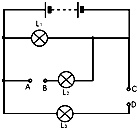如圖所示,L1、L2、L3是三個相同的小燈泡,A、B、C、D是四個接線柱,若只將A、B相連,則電燈