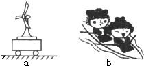 如圖中,a圖所示的是一個風(fēng)扇固定在小車上,當(dāng)風(fēng)扇向左吹風(fēng)時,小車會向右運(yùn)動; b圖所示的是福娃貝貝和妮妮正在運(yùn)動會上參加賽艇比賽時向后劃水,賽艇向前運(yùn)動的情景.上述兩個事例所運(yùn)用的相同物理原理是