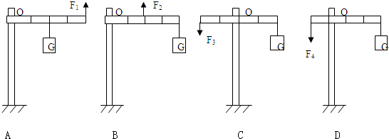 如圖所示,四個(gè)杠桿均處于平衡狀態(tài),各杠桿上懸掛的物體重力均相等,所需的力分別為F1、F2、F3、F4,其中最小的是(  )